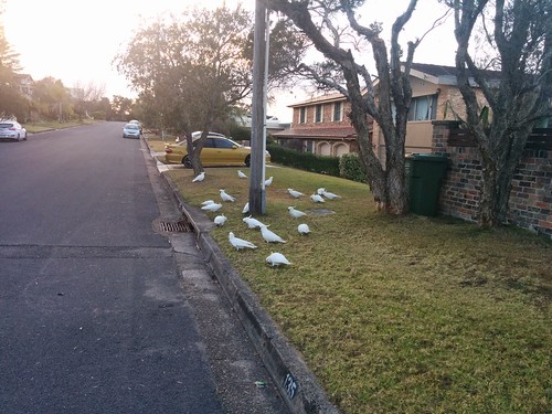 Out on the dog walk, a flock ( are they called that when they are on the ground ?) of cockies having a feed. There was one up in the tree behind them keeping a look out for threats.