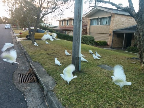 We have a bird feeder hanging just outside the window out the back. The cockies have become quite aggressive with it, scaring the other smaller birds away and often fighting each other for a perch. When the seed has run out they sit in the feeder and tap on the window, if we don’t feed them they sometime start tearing away at the side of the house. They are not afraid, often when I fill the feeder with new seed they will hold their ground and grab the spoon in their beak before I get a chance to empty the seed into the tray. Their beaks look like they would do a lot of damage to a finger!