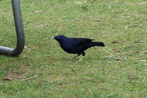 Male Satin Bowerbird. Only saw this one male, I think he was picking up scraps from near the table, or he might have been looking for blue things to decorate his bower