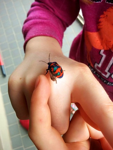 A few weeks ago we visited friends in their new highrise apartment in town. It was an awesome place, typical modern apartments, all fitted out with parking and facilities including a great indoor pool that we had a lot of fun in with the kids. They were on the 30th floor ( I think ) very high up anyway. It was the last place I would have expected to see some interesting wildlife but while Jess and I were out on the balcony scaring ourselves with the height ( ok, mostly me being scared ) I spotted a strikingly coloured bug crawling on the tiles. I gave it to Jess, we both marveled at it and took some photos. I’ve found it hard to identify bugs in the past and didn’t expect to be able to work out what this one is, but by luck someone had found exactly the same creature and sent in a photo to the North Shore Times where it was identified by the Australian Museum as a “Cotton Harlequin Bug”!