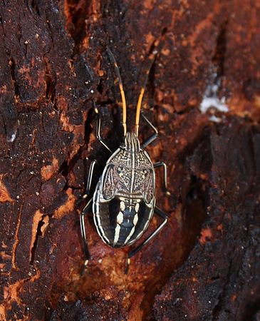 The bugs that I found appear to be in the nymph stage. The nymphs spend most of their time under the bark while the adults roam about on the outside of the tree and are better camouflaged. The patterns on the nymphs is captivating, it looks like an Aboriginal painting come to life.
